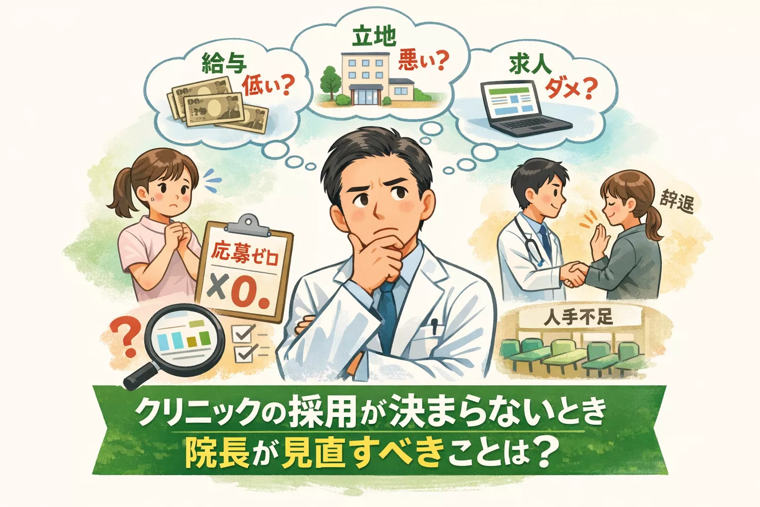 クリニックの採用がなかなか決まらないとき、院長の頭の中は「条件が悪いのか」「給料を上げるべきか」「場所が悪いのか」と、原因探しに向かいがちです。