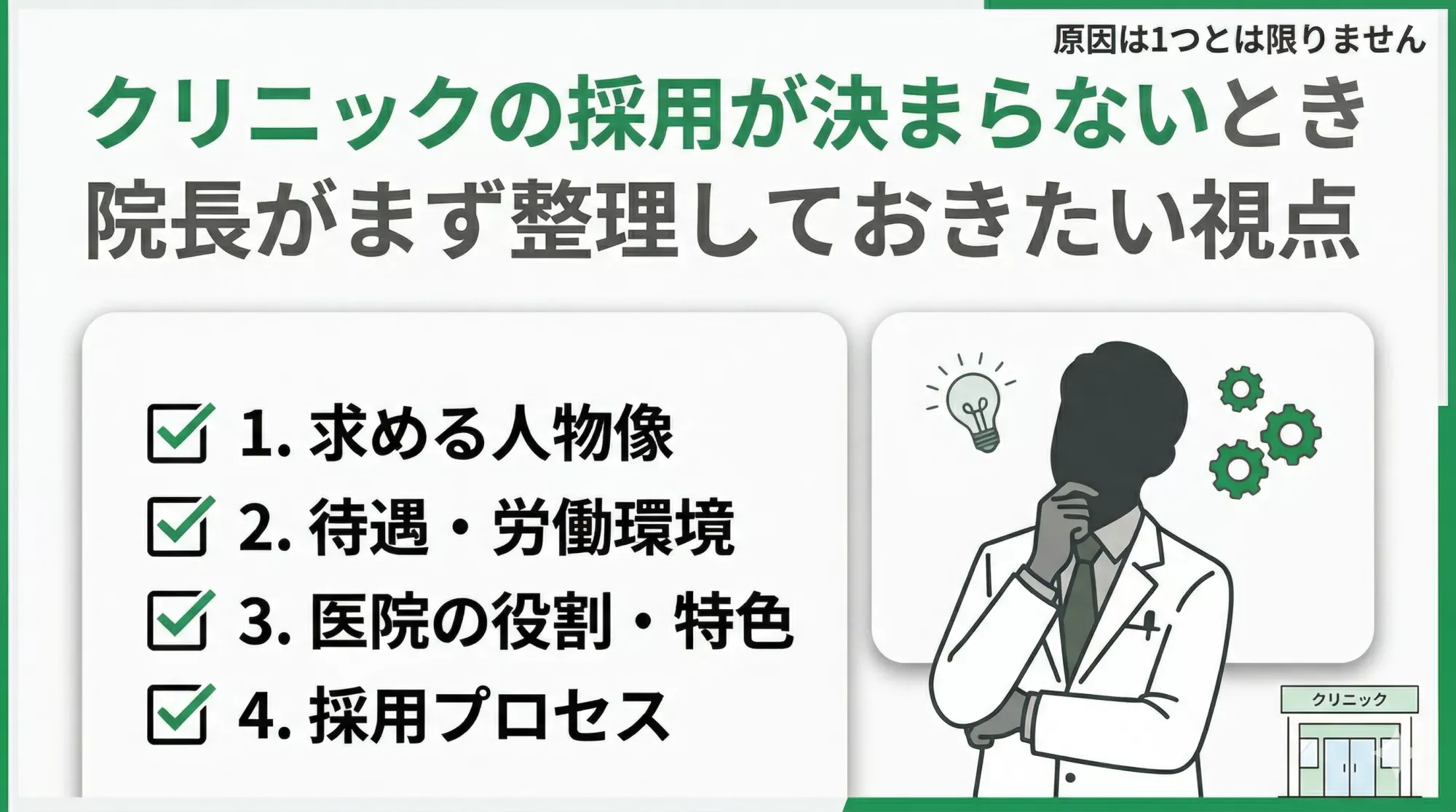 クリニックの採用がなかなか決まらないとき、まず大切なのは原因を1つに決めつけないことです。