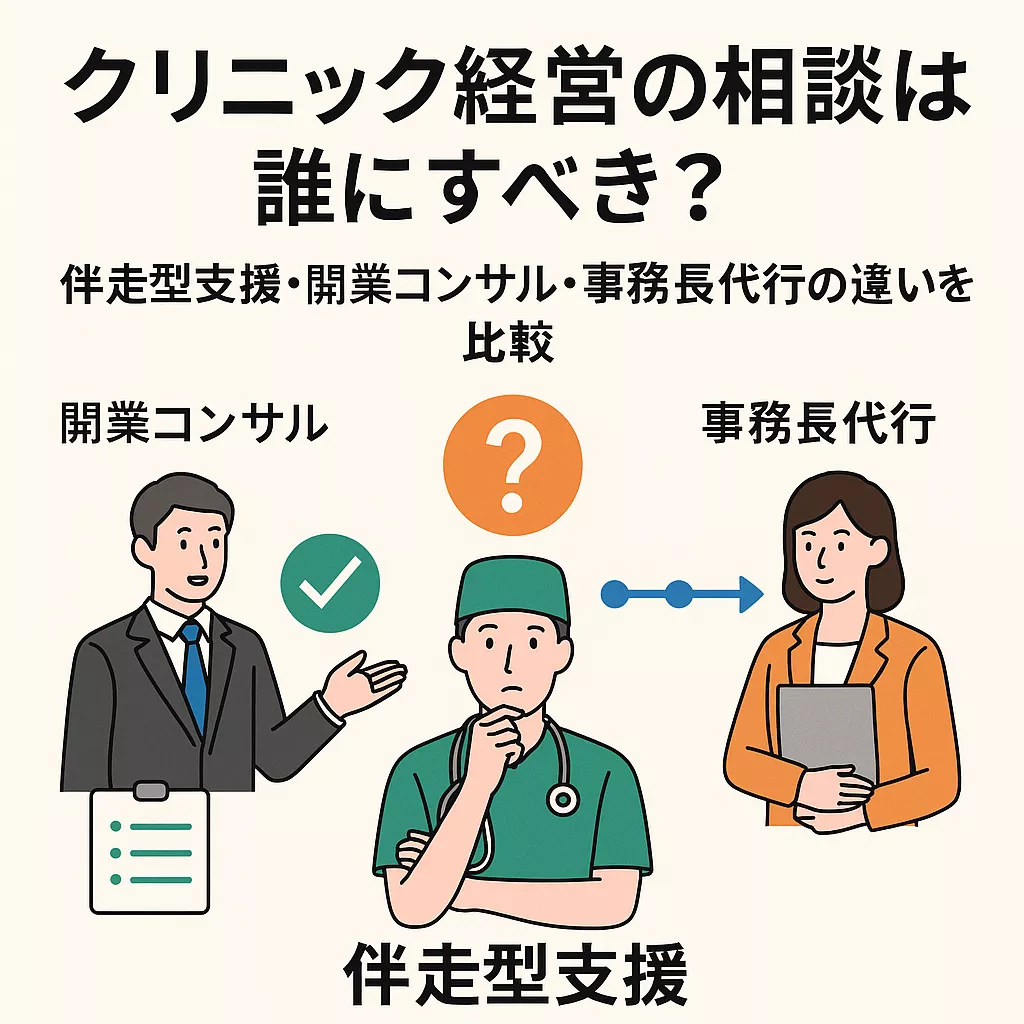 クリニック経営や開業準備の相談先として、「開業コンサル」「事務長代行」「伴走型支援」など様々な選択肢があります。 調べれば調べるほど、次のような迷いが生まれやすいものです。
