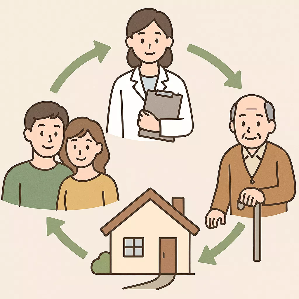 地域包括ケアシステムは、高齢者が住み慣れた地域で安心して生活できるように、医療・介護・生活支援が一体となる仕組みです。診療所はその一端を担い、病院中心から「地域全体で支える」体制への移行が求められています。