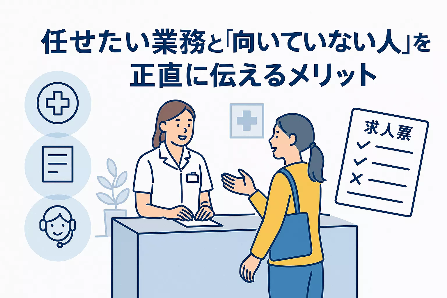 「患者さん対応が得意な方を歓迎します」「細かい事務作業が苦手な方には向いていません」と書くことで、合う人と合わない人を事前に仕分けできます。これにより、採用してすぐ辞めてしまうリスクを下げ、教育や採用コストの無駄を防げます。
