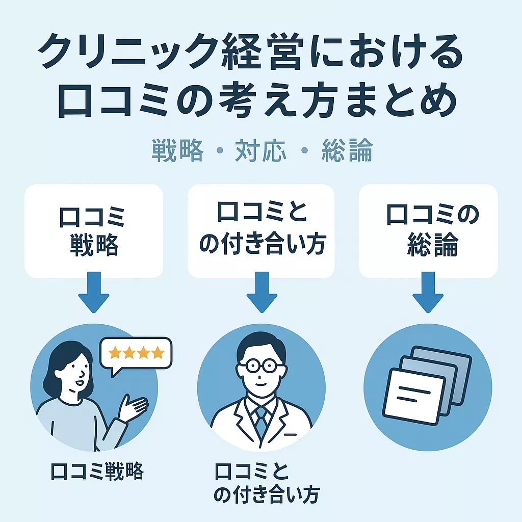 口コミは集患や信頼形成に欠かせない要素です。本ページでは「戦略」「対応」「総論」の3つの視点から解説した記事をまとめてご紹介します。