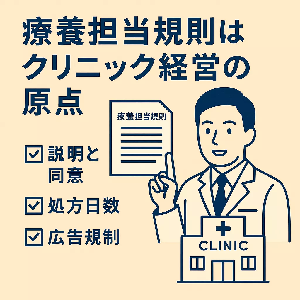 療養担当規則は、診療の方法、患者対応、処方、広告など、日々の業務の基本を定めています。これを軽視すると、診療報酬の返還や行政処分、地域からの信頼喪失といった重大リスクに直結します。一方、規則を理解し運用すれば、経営の土台が安定し、診療に集中できる環境が整います。