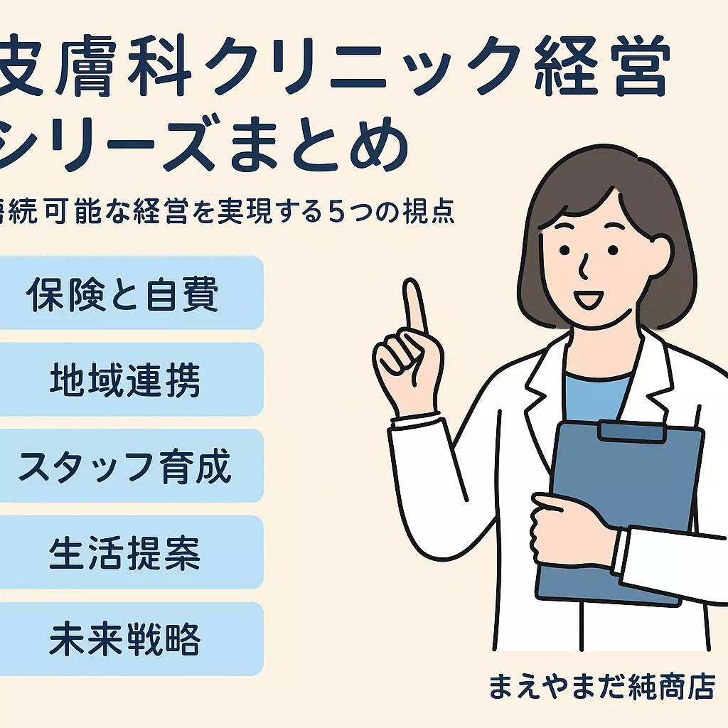 このシリーズでは、皮膚科クリニックがこれからの時代に「持続可能な経営」を実現するための視点を、テーマごとにまとめました。現場目線の実務と理念の両面から、「拡大ではなく、続く経営」のヒントをお届けします。