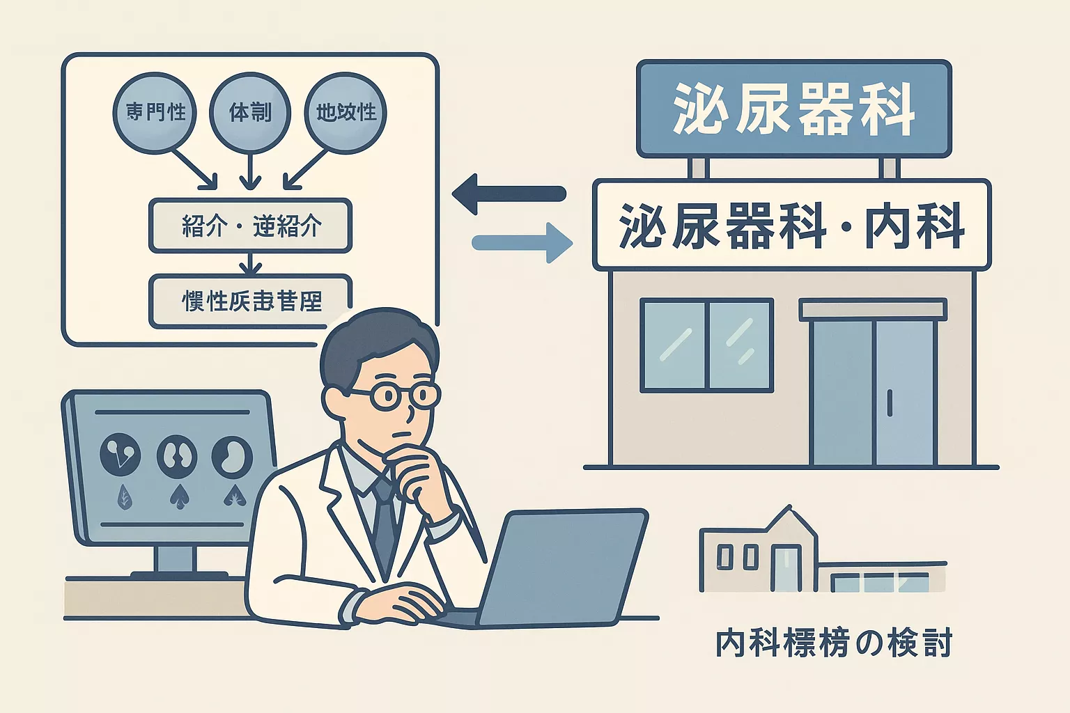 泌尿器のコアを保ちつつ無理のない体制、地域ネットワークとの調和、そして「腎臓を守る医療」という一貫したメッセージを維持できるか――これらが満たされるなら、内科標榜は有力な選択肢です。