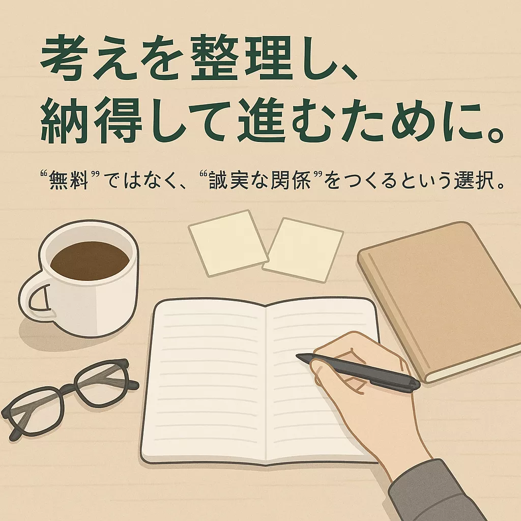 こうした“もやもや”を言葉にし、「今考えるべきこと」「次の一歩」を一緒に見つけていきます。 無料ではなく有料にしているのは、この時間を“対話の場”としてきちんと成立させるためです。 「無料だからとりあえず」ではなく、「有料だからこそ真剣に話す」——その小さな緊張感が、思考を深め、納得を生みます。