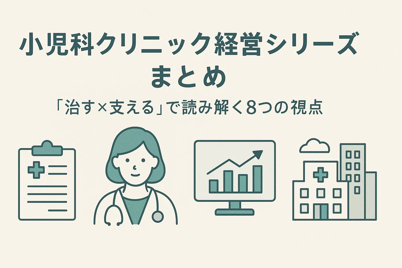 本シリーズは、小児科クリニックの経営を 「治す」と「支える」 の両輪で捉え直すための8本の記事で構成しています。