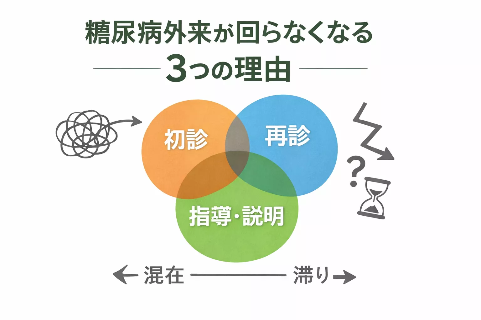 糖尿病外来が詰まりやすい背景には、いくつか共通する構造があります。ここでは、特に起きやすい3つのポイントを整理します。