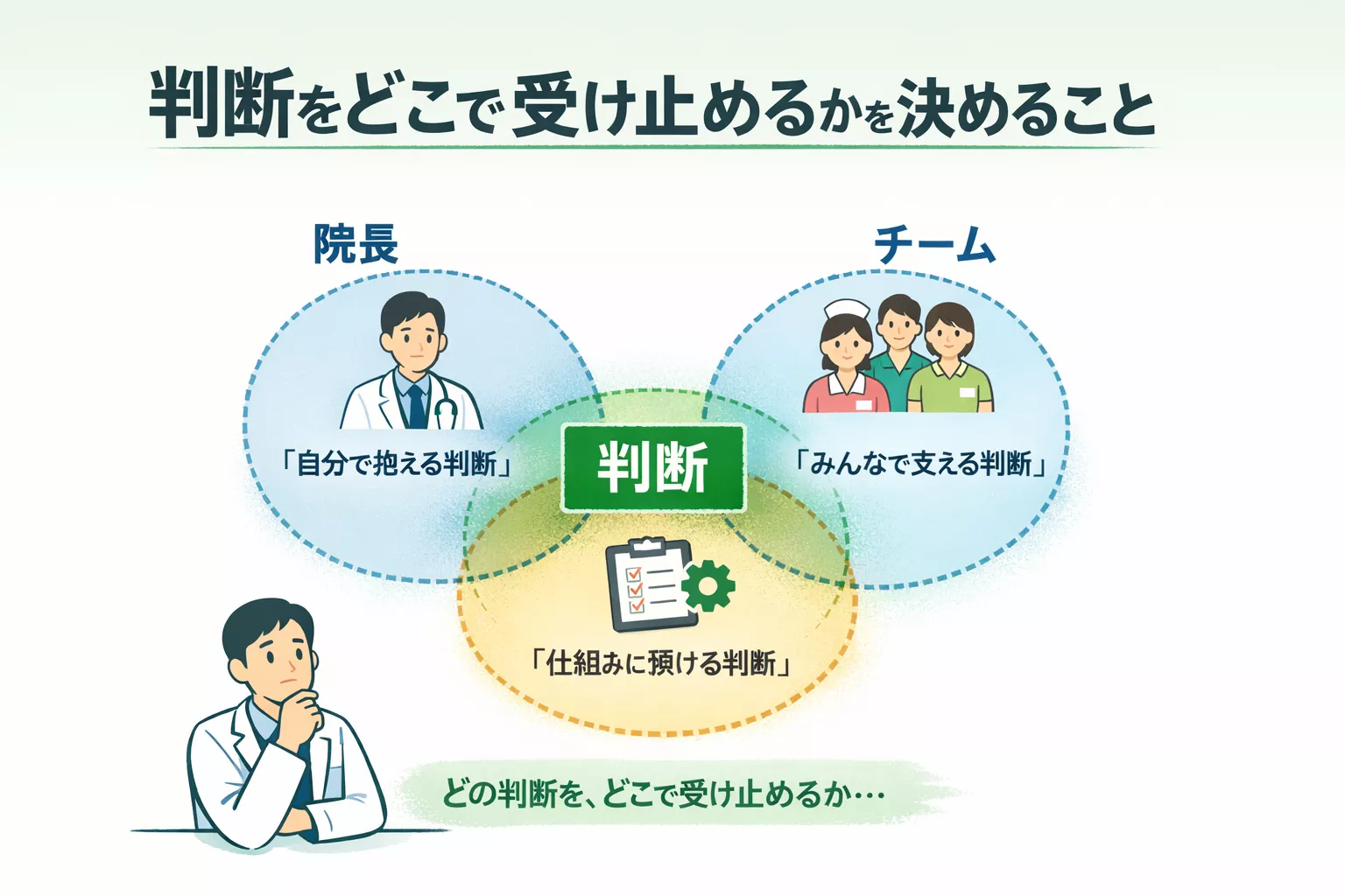 この視点を一歩進めると、役割分担とは、単に業務を振り分けることではなく、判断を「院長」「チーム」「仕組み」のどこで受け止めるかを考えることだと捉え直せます。